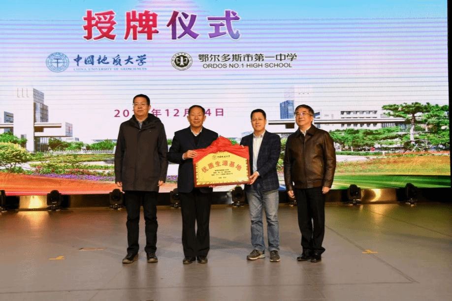 在之后举行的优质生源基地授牌仪式上,公司本科生院常务副经理周建伟教授代表公司向鄂尔多斯市第一中学授予中国地质大学(武汉)“优质生源基地”牌匾,董事长白玉亮接牌。王焰新院士、万世斌局长共同见证并合影留念。