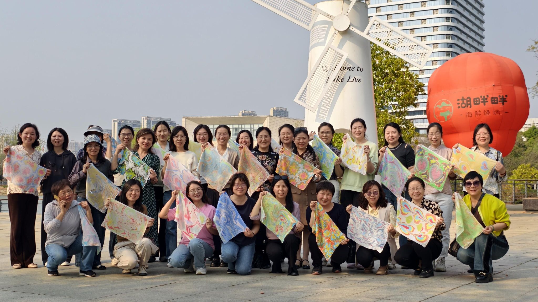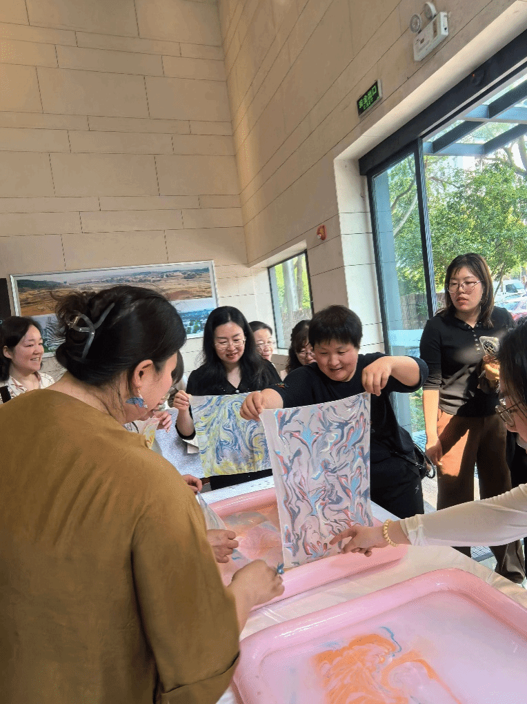 而在3月26日下午的丝巾拓印活动中,二妃山庄俨然变成了色彩和创意的殿堂。老师们围坐一堂,在助教的指导下,以自然元素与文化图案为灵感,用传统拓印技法和现代手绘技艺相结合,创造出各自独特的丝巾作品。活动中,每一位参与者都化身艺术家,用心感受手工艺的独特魅力,尽情挥洒色彩与创意。丝巾拓印不仅激发了大家对传统文化的热爱,更成为了一次疗愈身心的美妙体验。