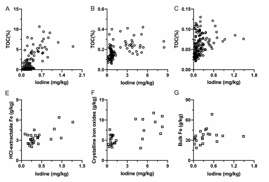 图2 大同盆地(A、E)、河套盆地(B、F)和华北平原(C、G)含水层钻孔沉积物样品中总碘浓度与总有机碳或不同类型铁浓度之间的关系。