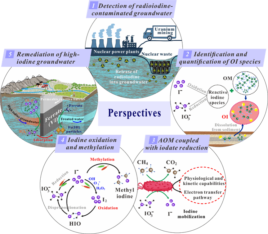 为了全面理解地下水系统中碘的水文-生物地球化学行为,探索可持续的地下水资源治理和供给方案,以及全球碘循环认识,本研究建议从以下五个方面(图5)开展工作:(1)核设施及核废料处置场地地下水系统放射性碘的监测和风险评估;(2)地下水系统OI种类的鉴定、定量以及形态转化;(3)甲烷厌氧氧化耦合IO3−还原的分子机理和环境效应;(4)地下水系统中I− 氧化和甲基化过程;(5)高碘地下水的原位修复技术。