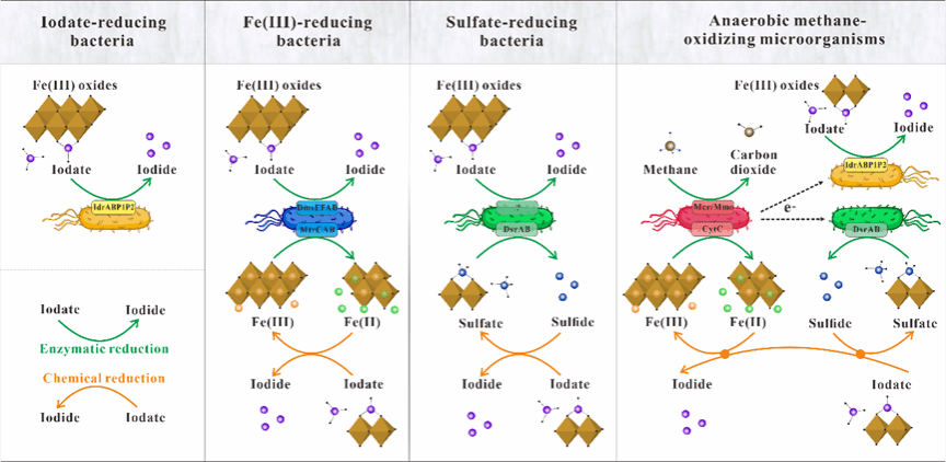 微生物介导的碘形态转化是地下水系统I−生成的主要推手。鉴于IO3−和OI是含水层沉积物中碘的主要形态,IO3−还原和OI降解对地下水中I−的形成和富集发挥着重要作用。含水层中的多种生物地球化学过程参与了IO3−还原,例如异化IO3−还原、铁还原、硫酸盐还原,和甲烷的厌氧氧化(图4)。其中既有直接的IO3−酶促还原,也包括间接的代谢还原态产物的IO3−化学还原。此外,OI中碘也能够通过微生物降解或脱卤作用释放到地下水中。