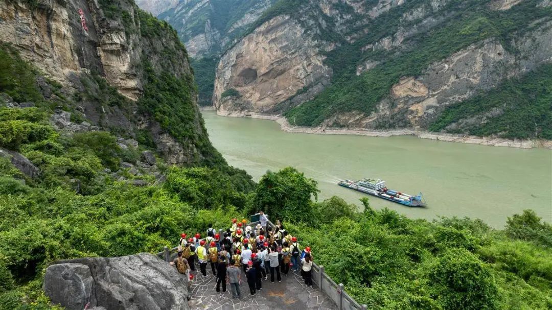 7月17日,中国地质大学(武汉)师生在秭归县链子崖观测长江两岸岩层。