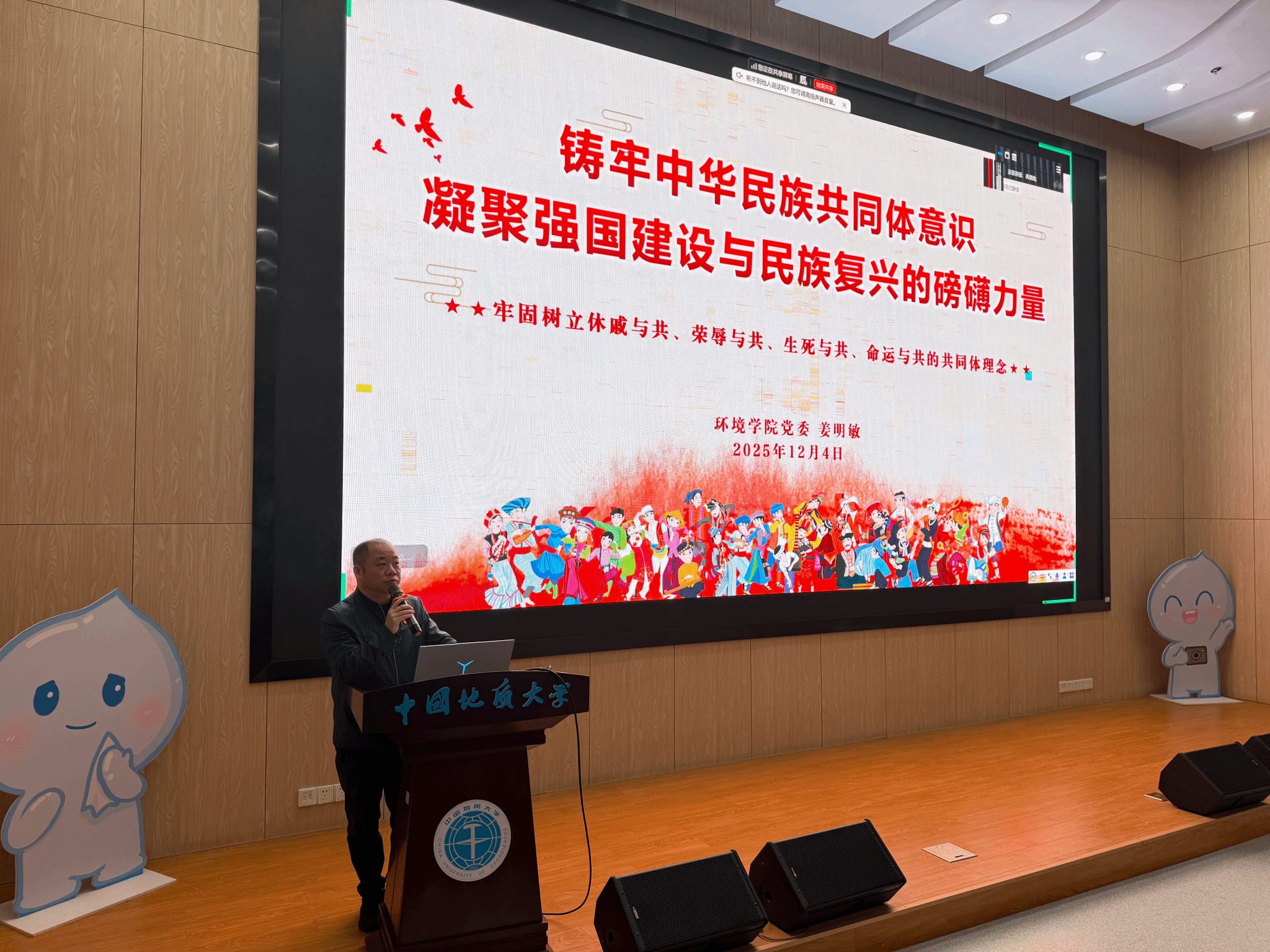 姜明敏围绕“铸牢中华民族共同体意识,凝聚强国建设与民族复兴的磅礴力量”主题展开讲授。他介绍,党的十八大以来,以习近平同志为核心的党中央把铸牢中华民族共同体意识作为新时代党的民族工作的主线、作为民族地区各项工作的主线,为推进中国式现代化凝聚起民族团结的磅礴力量。他带领大家回顾铸牢中华民族共同体意识的提出与发展,勉励大家要充分认清铸牢中华民族共同体意识的重大意义、准确领会铸牢中华民族共同体意识的丰富内涵,从而牢牢把握铸牢中华民族共同体意识的实践途径。最后,他分享了公司和公司在铸牢中华民族共同体意识方面的实践成果,通过开展多元的文化交流活动,促进各少数民族学子在校园中实现文化互通、成果共享,共同营造团结和谐文化氛围。