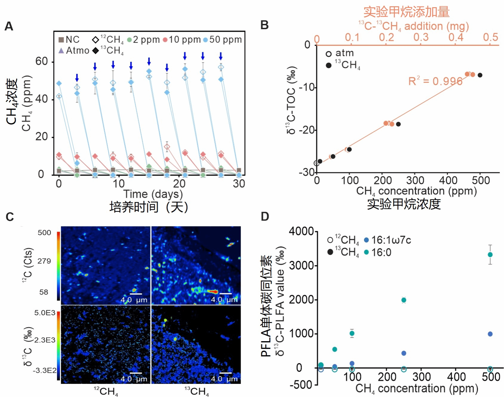 为确证这些微生物在地下环境中的代谢活性,团队开展了不同浓度甲烷(2–500 ppm)补给的微宇宙培养。实验观测到稳定的甲烷消耗,并利用13CH4同位素示踪、NanoSIMS成像和PLFA-SIP技术,精准捕捉到了13C从13CH4向微生物生物量(如13C-TOC、13C-PLFAs)转移的清晰信号(图1),从而以确凿证据证实,这些洞穴微生物不仅能够消耗甲烷,还可以将其转化为自身细胞物质。