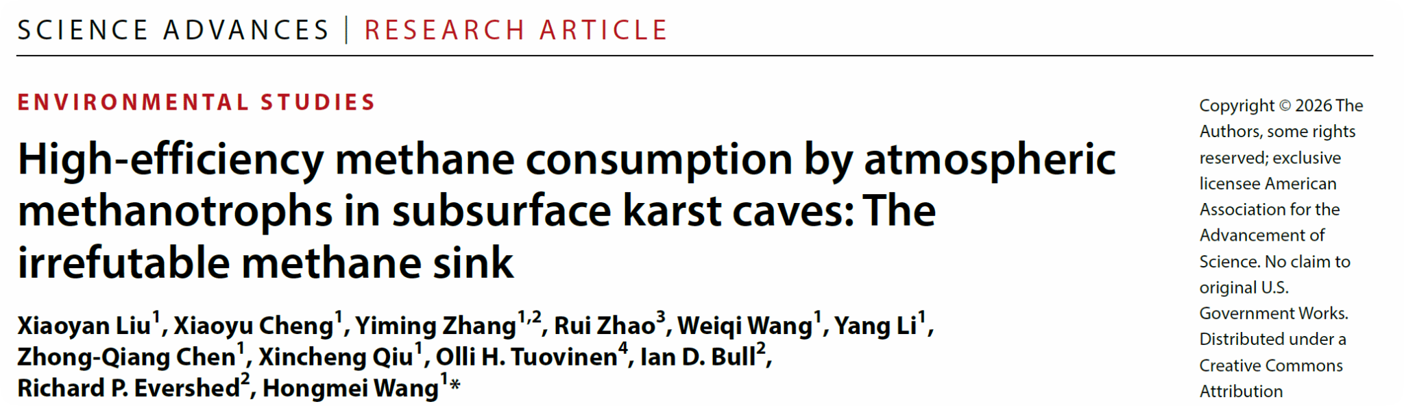 (通讯员刘邓、马丽媛 编辑申墁烨)2月5日,公司王红梅教授团队联合公司地质微生物与环境全国重点实验室,与美国麻省理工公司、俄亥俄州立大学及英国布里斯托大学等单位合作,在《科学进展》(Science Advances)发表研究成果。该研究综合运用微宇宙培养、稳定同位素示踪及多组学技术,首次系统揭示了喀斯特洞穴中大气甲烷被高效氧化的微生物驱动机制,证实了地下喀斯特生境是一个此前被严重低估的大气甲烷汇。这一发现深化了对陆地生态系统甲烷循环过程的认识,为更准确评估全球甲烷收支提供了科学依据。