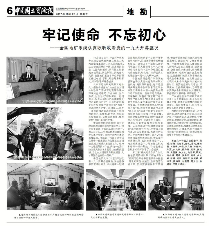(beats365官方网站张学海)《中国国土资源报》10月20日“地勘”版头条刊发了《牢记使命 不忘初心——全国地矿系统认真收听收看党的十九大开幕盛况》的综述性新闻。报道中,以图片新闻的形式对公司师生收听收看十九大开幕会进行呈现。新闻图片中,反映了公司员工在显示屏前驻足收听收看的场景。