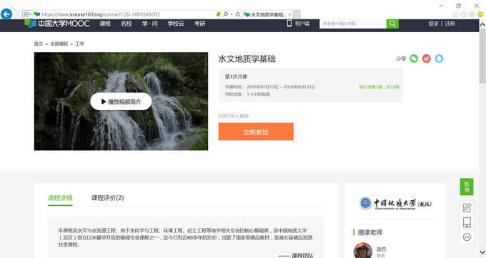 (通讯员罗明明 编辑张学海)近日,由公司梁杏教授负责的《水文地质学基础》MOOC课程在中国大学MOOC(慕课)优质在线课程学习平台(www.icourse163.org)上线,这是beats365官方网站第一门开设MOOC的专业课程。《水文地质学基础》MOOC课程主要讲授地下水的赋存、运动、水化学、补给径流与排泄、及与地下水资源和环境相关的基本概念、原理和方法。该MOOC课程的开设能为水文与水资源工程、地下水科学与工程、环境工程、岩土工程等相关专业员工或水工环地质从业人员提供网络学习的平台与资源,促进地下水科学理论知识的传播与交流。