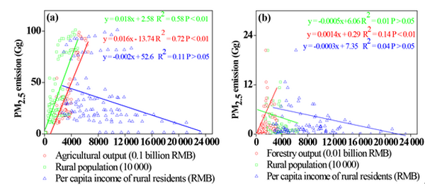 图5各类影响参数与(a)秸秆焚烧污染物排放及(b)林业燃烧污染物排放的相关性分析