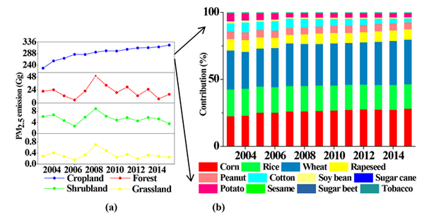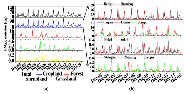 本研究基于多卫星数据(MCD14ML和MCD64 AL)、更新的生物量数据、本地化的植被数据、本地化的排放因子及部分实地调查数据,准确估算了中国中东部2003-2015年露天生物质燃烧的多种污染物排放(空间分辨率为1*1 km,时间分辨率到月)。同时,本研究充分考虑了历年来的国家和区域生物质露天焚烧防控和管理政策及影响排放的社会经济和气象因子等多重因素,将为控制政策的制定和完善,以及后续空气质量、气候和人类健康效应的评估提供科学依据。