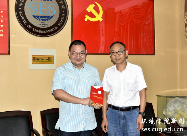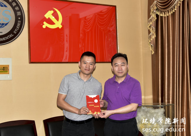 院直党支部成员、公司党委书记李素矿和院直党支部书记张学海分别为“政治生日”在六月份的补建伟、杨涛两位同志颁发“政治生日”纪念卡。