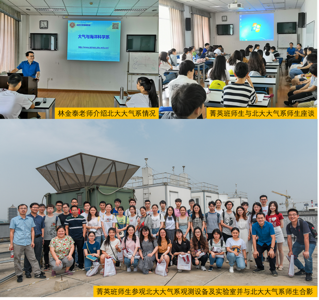 7月13日,在北京大学大气与海洋科学系(北大大气系)林金泰老师的协调下,大气科学菁英班师生参观了北大大气系,并与北大大气系林金泰老师、张霖老师以及研究生和本科生代表座谈。座谈会在师生共同观看了北大大气系90周年系庆视频之后开始。座谈会上林金泰老师首先介绍了北大大气系的基本情况,之后由各位研究生代表分别介绍了自己所在课题组的情况。随后,由本科生代表介绍了北大大气系本科课程学习情况和参与科研的情况。之后,北大大气系林金泰和张霖老师表示,鼓励本科生参与科研,重在参与,主要目的是对员工将来的职业规划有帮助,而非为了发表文章。座谈会在非常愉快的氛围中进行。座谈会后,在北大大气系研究生和本科生的引导下,菁英班师生愉快地参观了北大校园。
