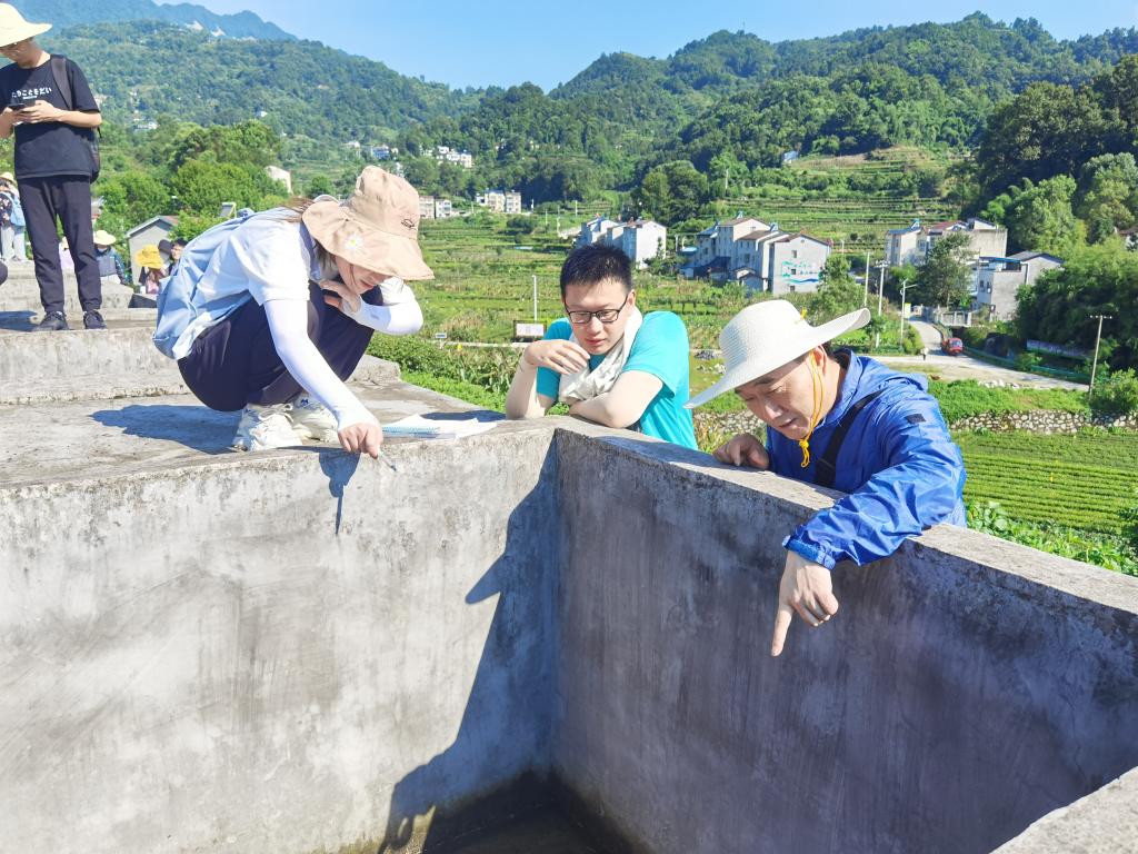 李素矿与员工一同观察张家冲水土保持站沉沙池的水位情况