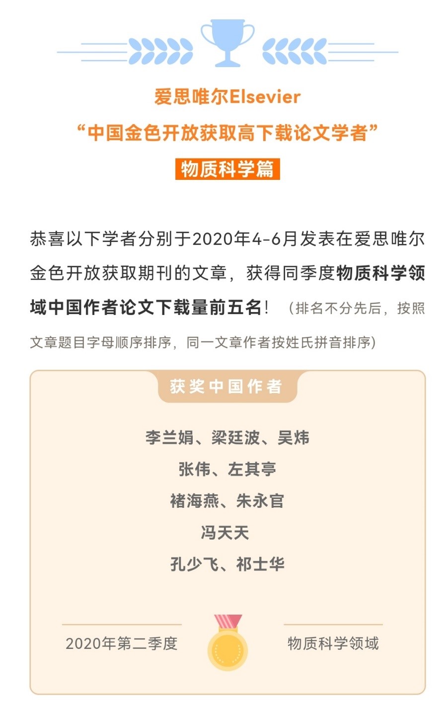 (编辑严丽莎)近日,爱思唯尔(Elsevier)中国金色开放获取高下载论文学者(2020年第二季度物质科学篇)榜单公布,来自国内5个高校、科研单位的10位学者入选该榜单,公司孔少飞教授、祁士华教授入选。