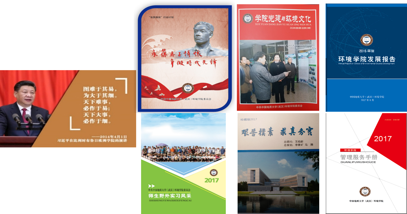 五年来,“张国旗班”行动计划始终在积极营造浓厚的文化氛围,打造特色思政文化品牌,滋养环境文化根系。公司倾力打造 “1+6”思政育人载体,如:《我最喜爱的习近平总书记的一句话》系列明信片,将新思想、新理念播撒在员工的心中;每年编印《师生野外实习风采展》,记录环境学子在山水林田湖草间躬行的身影;院刊《公司党建与环境文化》至今已编印34期,记录公司党建工作动态;《beats365官方网站年度发展报告》则集中梳理历年公司发展的高光时刻;《师生管理服务手册》做到精细化服务师生 ;创作的院歌《艰苦朴素 求真务实》人人传唱,唱出环境人的豪迈;《“张国旗班”行动计划画册》浓缩着环境学子的成长历程。