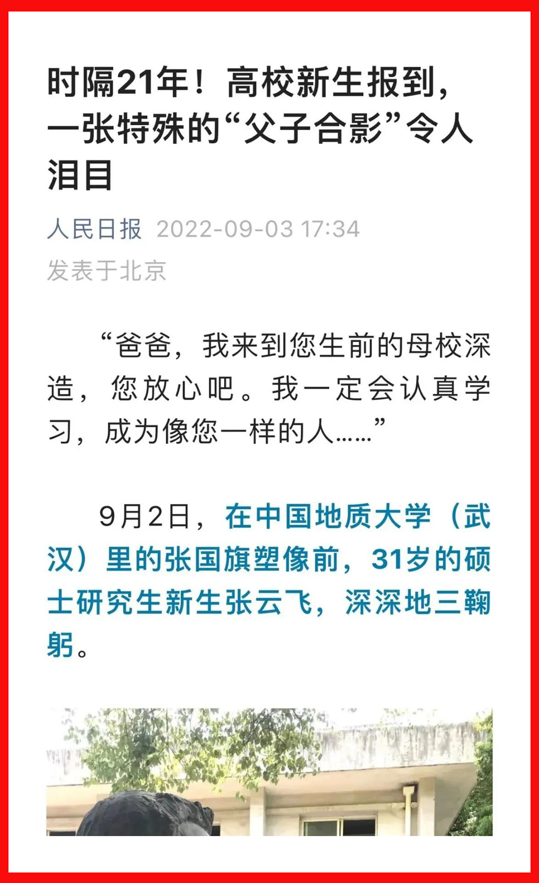 9月2日,在中国地质大学(武汉)里的张国旗塑像前,31岁的硕士研究生新生张云飞,深深地三鞠躬。