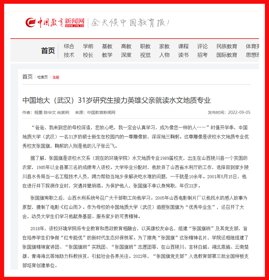 “英雄无愧时代,时代不负英雄。张云飞是英雄的后代,立志走父辈英雄之路来校深造,我们有责任并创造条件帮他圆梦、助其成才,成为新时代的生态环保铁军,更好地建设家乡。”一直关心着张云飞及其家人的中国地质大学(武汉)公司党委书记李素矿欣慰地说。(中国教育报-中国教育新闻网 记者 程墨 通讯员 陈华文 尚紫荆)