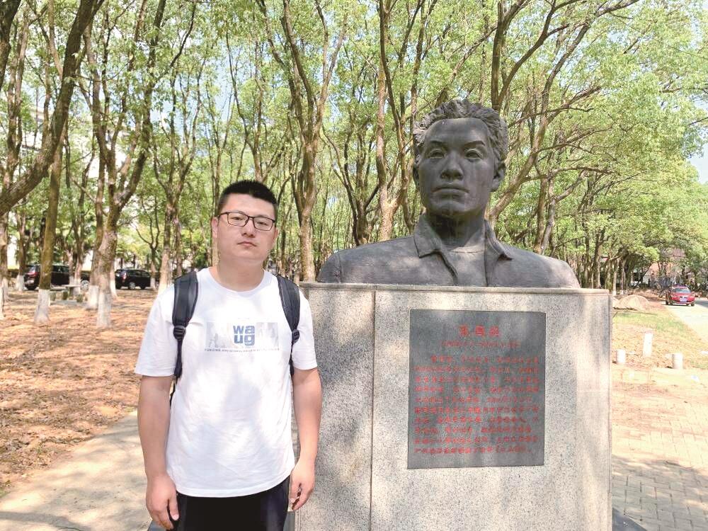 新生报到,他给父亲雕像献花