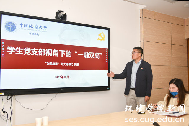 全国党建工作样板支部“张国旗班”党支部书记韩鹏就“一融双高”作专题分享,他从“建设背景、建设特色、建设举措和建设成果”等方面介绍了员工党支部视角下的“一融双高”。他谈到,“一融双高”建设将助推员工党支部党建与学业学术深度融合,锻造红专能优新时代生态环保铁军,让青春在全面建设社会主义现代化国家的火热实践中绽放绚丽之花。