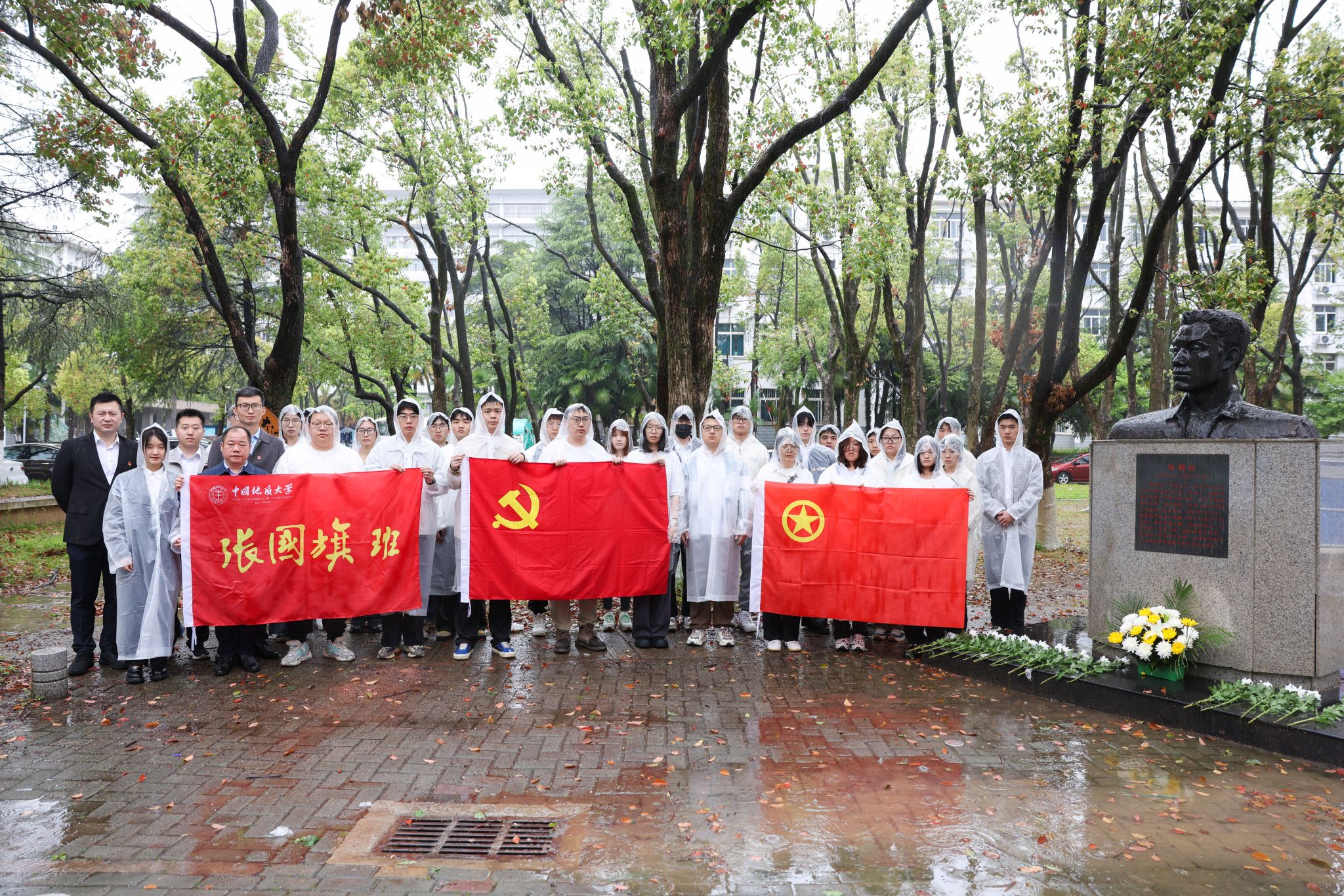 张云飞与全体师生向张国旗雕像献花并默哀一分钟。