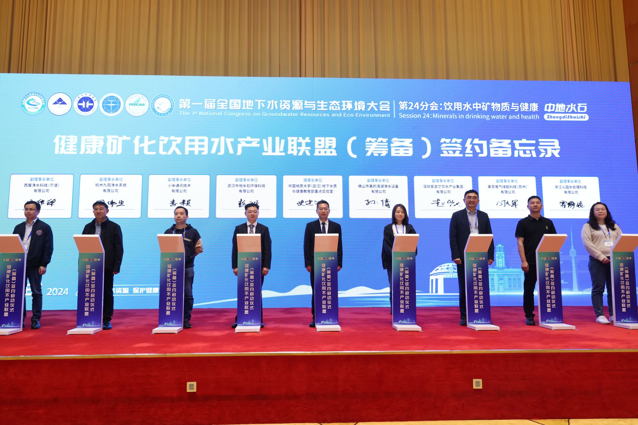 参与此次签约仪式的单位有:公司地下水质与健康教育部重点实验室、武汉中地水石环保科技有限公司、佛山市美的清湖净水设备有限公司、小米通讯技术有限公司、深圳安吉尔饮水产业集团有限公司、杭州九阳净水系统有限公司、莱克电气绿能科技(苏州)有限公司、西屋净水科技(宁波)有限公司、浙江沁园水处理科技有限公司等。这些企业的参与为联盟的筹建注入了更多动力和活力。