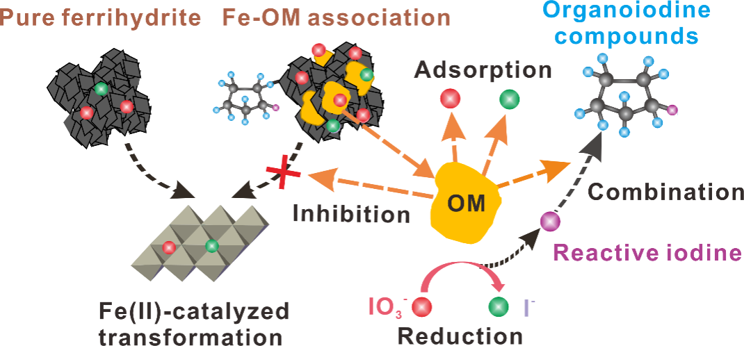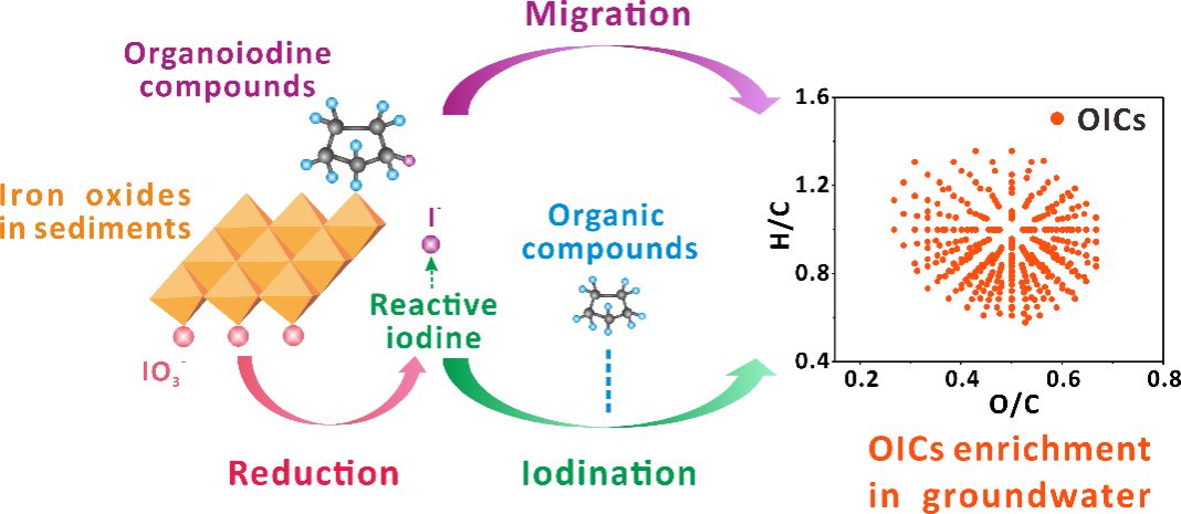 长期摄入高碘地下水(碘浓度>100µg/L)会造成人体甲状腺机能损伤。水源性高碘甲肿已成为全球普遍存在的环境健康问题。地下水系统中的碘通常以无机碘(碘离子和碘酸盐)和有机碘的形态存在。有机碘化合物是无机碘与天然有机质结合的产物,具有强细胞毒性和基因毒性,其形成机制与控制方法在消毒副产物研究中备受关注。然而天然地下水环境中有机碘化合物的来源与形成机制尚不清楚,与铁矿物结合有机质介导的碘形态转化研究十分有限,天然地下水中有机碘化合物的环境健康风险仍存在诸多不确定性。