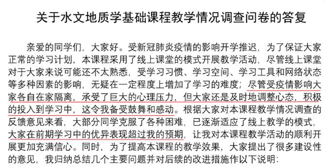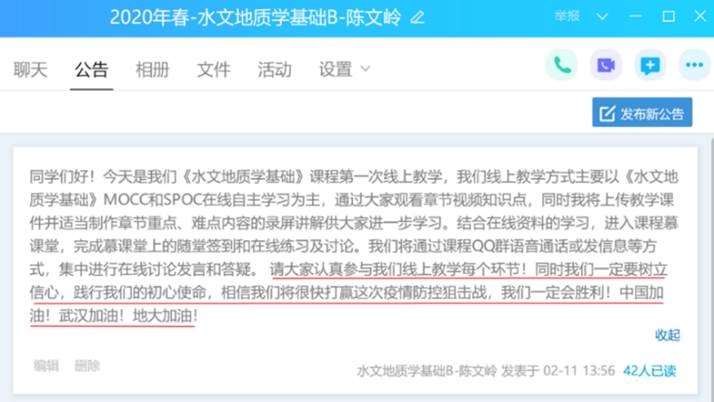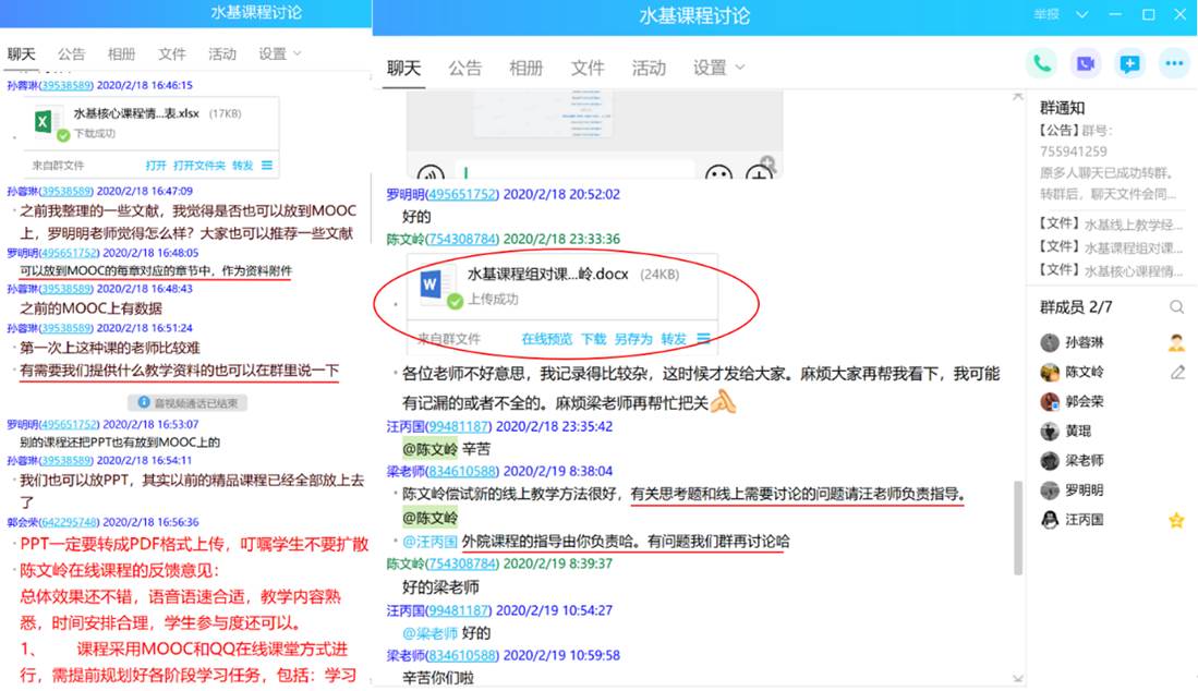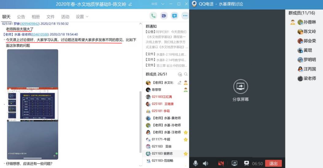 对课程组两位任课老师线上教学时遇到的具体问题,随时在课程组群里进行交流讨论。为了及时对线上教学过程中出现的问题进行总结,优化混合教学模式,切实提高教学效果,课程组团队全体成员于2月18日聆听陈文岭老师为资源公司和地公司讲授《水文地质学基础B》线上课程。课后,课程组通过QQ群语音通话方式进行了集体研讨(约90分钟),对本次线上教学过程中取得的效果、出现的问题进行了系统的总结,集体备课、集中讨论对优化混合教学模式和线上课程的高效开展大有裨益!