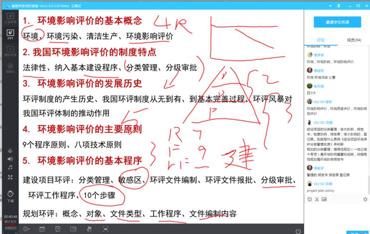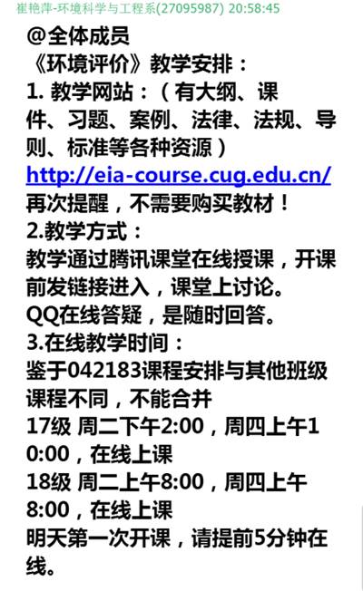 针对《环境评价》课程内容多,知识点琐碎的特点,教学方式采用“网络教学资源+腾讯课堂直播讨论+课堂作业”的方式开展。建立了《环境评价》教学网站,提供大纲、课件、习题、案例、法律、导则等各种资源,方便员工的预习和复习,课堂中以重点内容讲解、问题反馈、讨论、习题的方式,对存在问题和重点内容进行讲解。