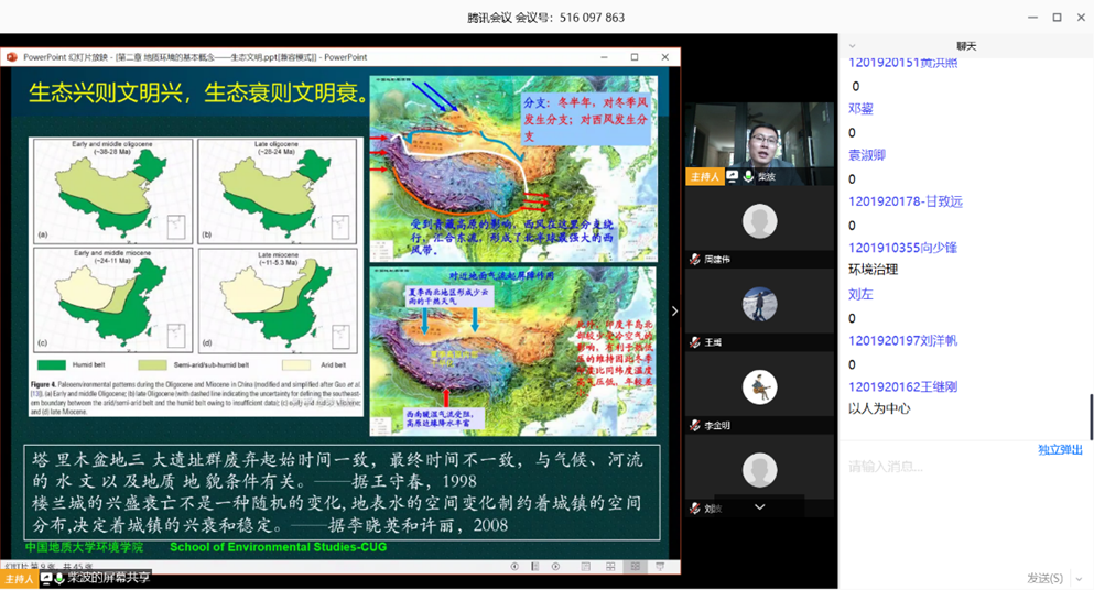 2月16日,接到省教育厅高教处的通知,教育厅陶厅长及相关处室希望2月17日(周四)下午听一下中国地质大学(武汉)的课程。因本科生周四下午基本不开课,选定听研究生周四下午的《环境地质学》。安排柴波老师做准备,周建伟老师辅助第二天的远程教学。当晚,研究生院通知,教育厅学位办也希望听公司的研究生课程。于是,决定合在一起,把《环境地质学》作为周四教育厅调研远程线上教学的观摩课程。