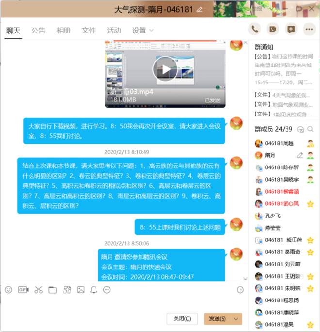 为保证线上教学效果,首先在群公告明确上课要求:1)每次上课前5-10分钟登录qq,确保上课期间通讯正常。2)上课期间,请将通话功能关闭,仅回答问题时开启通话及摄像头。3)点名时请开启通话及摄像头。其次,将上课时间发在群公告上,提醒员工们按时上课。第三,由于员工们没有教材,所以至少提前1天将课件上传到群里,供员工预习。为了督促教师和员工的线上教学,大气系的系主任李双林老师、支部书记孔少飞老师、046181班主任顾西辉老师和燕莹莹老师加入课程qq群。