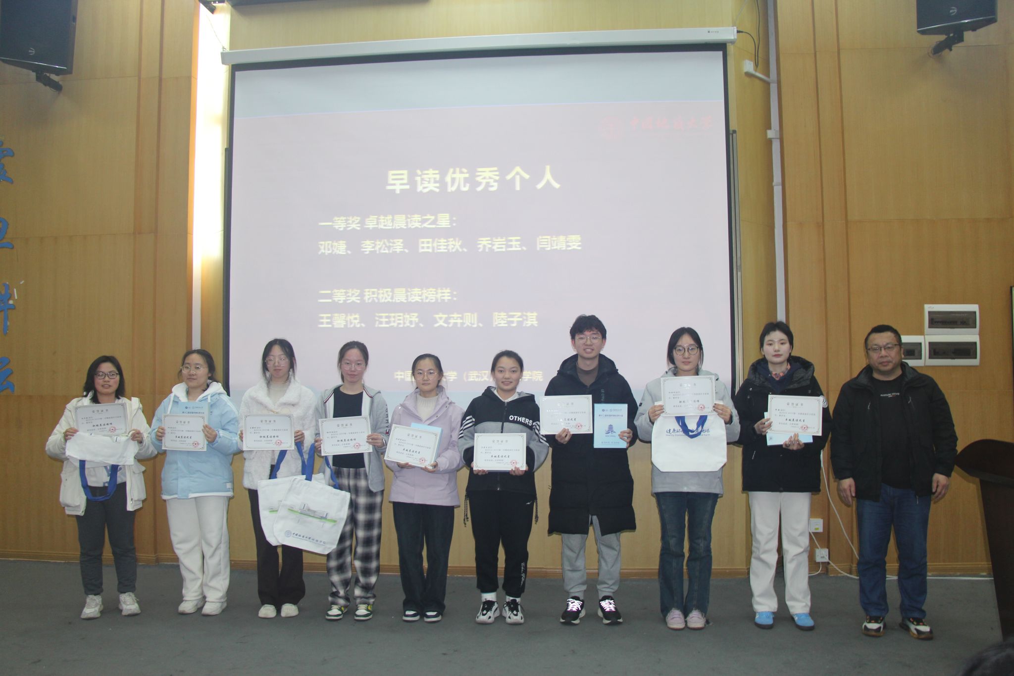 潘欢迎老师为早读优秀个人颁发荣誉证书