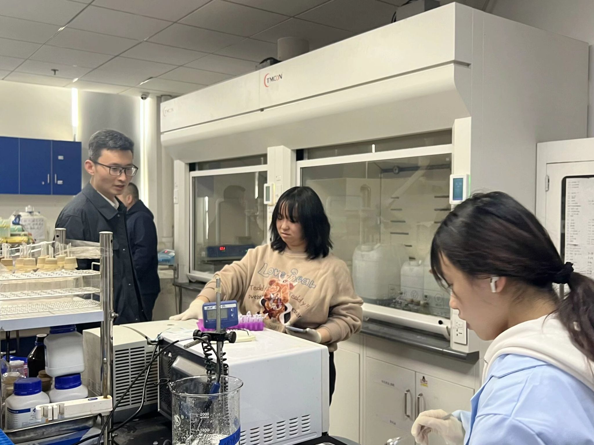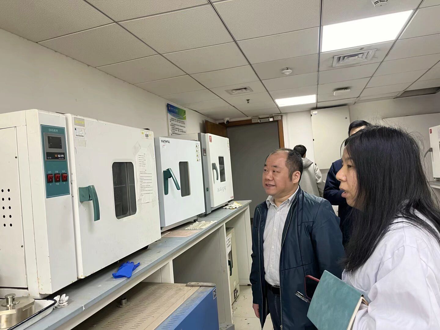 公司党委书记姜明敏、实验教学中心梁莉莉、辅导员赵恩民等检查走访研究生工作间、高温室等教学科研实验室。