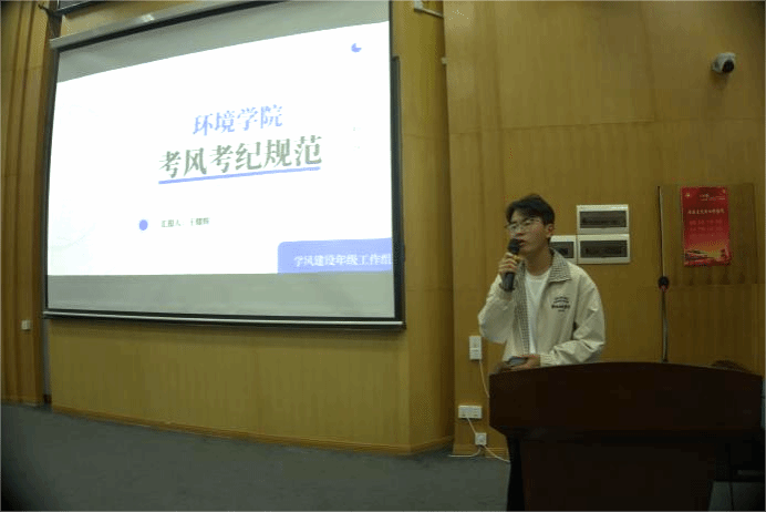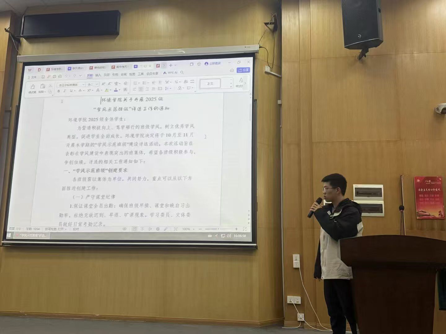 学风建设组赵梓宇宣读“弘扬践行‘严在地大’学风”倡议,从日常考勤、课堂纪律、自主学习等方面呼吁全体新生以积极态度投入学习中,争做学风建设的践行者。付博涵介绍2025级本科“学风示范班级”创建活动的相关事宜。从课堂纪律到诚信准则,鼓励大家通过组建“学习互助小组”、共享学习资源库、撰写“最美笔记”等措施争创“学风示范班级”,在竞争中提升自身能力。