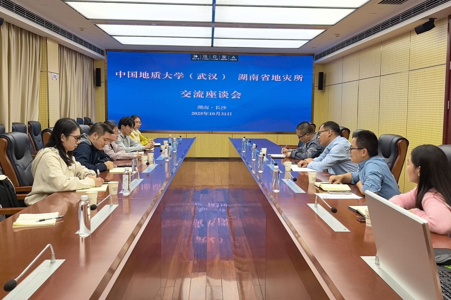 在湖南省地质灾害调查监测所,双方围绕员工就业、人才培养、学术科研、地质e站建设等开展交流。湖南省地灾所副所长周鑫,水文地质院姚腾飞,环境地质院周华、黄郁淇参与交流。与会人员集体观看湖南省地灾所宣传片,深入了解该单位在地质灾害监测、防汛抢险、矿山生态修复等一线工作场景。与会人员围绕行业发展、市场需求、员工能力培养以及就业技能提升等开展交流。