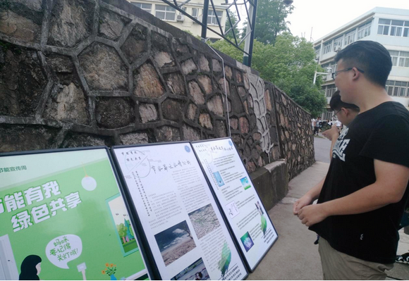 地大学子驻足阅览节能宣传展板