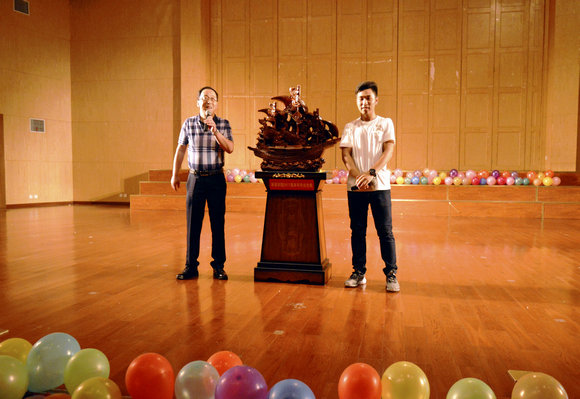 2017届毕业生代表曲乐向马腾经理捐赠木雕“一帆风顺”