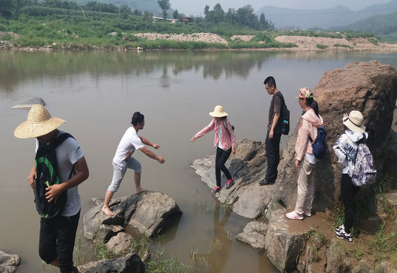 同学们相互帮助渡过大石河