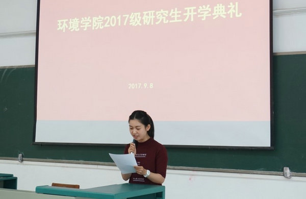 2017级研究生新生代表严璐发言,她代表新生向公司、老师表示感谢,结合自身的经历,表示研究生阶段,要以勤为径,以苦作舟,努力成为更有境界、更富魅力、更受尊重的人。