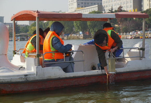 取样组的学子乘坐游船对每个取样点采取两份样品,并读取水温,将其中一份样品运送给湖岸上的检测组队对湖水的pH、水温、电导率等水质指标进行检测,另一份样品则带回地大实验室对总氮等剩余指标进行检测。