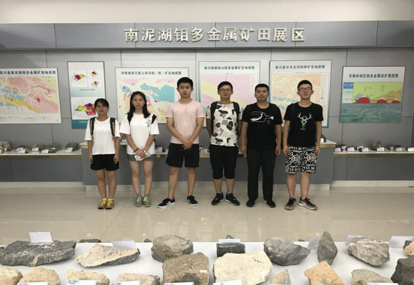 在这里,我们通过视频短片了解了栾川县的主要矿产分布与其形成过程。参观展厅的过程中,通过地矿局环境资源科科长张崇晃学长的讲解我们了解到,为进一步解决栾川县矿产资源综合利用、深部找矿、绿色矿山、地质矿山公园建设等科研难题,中国地质大学的赵鹏大、莫宣学、翟裕生和王成善院士曾多次来到实地进行科学研究,为栾川的矿产资源多元发展做出了巨大贡献。