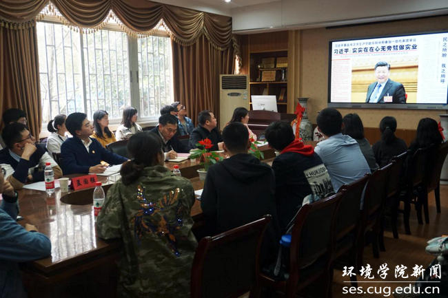 与会人员集中观看2019年“两会”期间习近平总书记重要讲话视频和生态环境部部长李干杰答记者问视频。