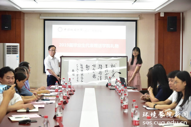 本科毕业生郭文杰代表2019届全体毕业生向公司赠送礼物。马腾代表公司接收礼物。