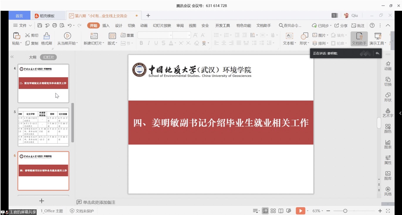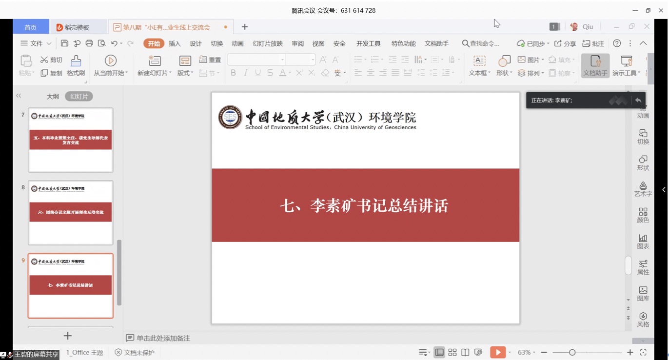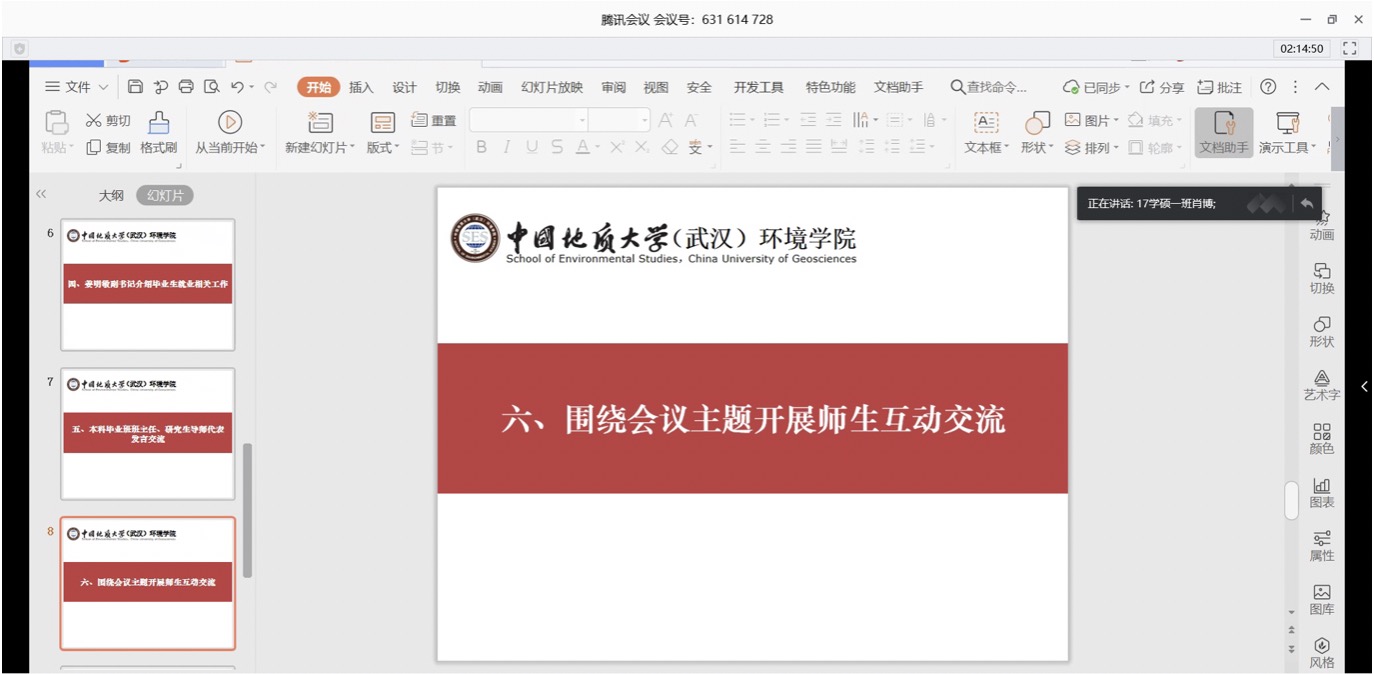 李素矿作总结讲话。他首先代表公司感谢老师和同学们在此次新冠肺炎防控战疫中做出的积极贡献。他说,时间如梭,转眼就到了同学们毕业、就业之际。往年的面对面、换成了今年的线上远程交流,疫情阻挡不了师生之间爱和友谊。他表示,对同学们此次“小E有约”师生线上交流会上提出的意见建议,公司立行立改,马上研究,及时回应。他指出,当前同学们面临毕业、就业两个主要问题,其中顺利毕业是高质量就业的前提和基础。行百里者半九十。同学们在最后一个学期,一定要精准学业,通过线上学习,修好学分、完成课程、做好毕设、写好论文,克服困难完成最后一公里的学业。打铁还需自身硬。面对就业,无论直接工作、升学读研、出国深造等哪种方式,同学们都要以积极的态度、满满的自信,做好人生规划,多与老师、同学、学长、家人、亲朋、用人单位等进行沟通交流,确定好的就业方式,尽早找到自己满意、幸福的社会第一站。他要求,全体班子成员、系室主任、党支部书记、全院教师、班主任、辅导员都要参与进来,彰显三全育人、党建标杆的力量,诠释“大爱” 精神情怀,关注关心毕业生们的学业、就业状况,解决好同学们的切身利益和具体实际困难。同学们所在的班团干部和党支部书记也要一起行动起来。全院上下一定要“拧成一股绳”,心往一处想、劲往一处使,为毕业生们做好指导帮助,履行好公司产品的出口这一关键环节。他强调,同学们要认真学习领会习近平总书记给北京大学援鄂医疗队“90后”党员的回信精神。牢记总书记的殷切期望和谆谆嘱托,践行生态文明思想,争做为国分忧、为民解困、红专能优的生态环保铁军,让自己的青春在党和祖国人民最需要的地方绽放绚丽之花,在实现中华民族伟大复兴的中国梦征程中书写自己的人生华章。最后他还提醒同学们,在当前疫情持续向好的态势下,一定要继续做好防护,居家学习生活,做到学习好、生活好、身体好。