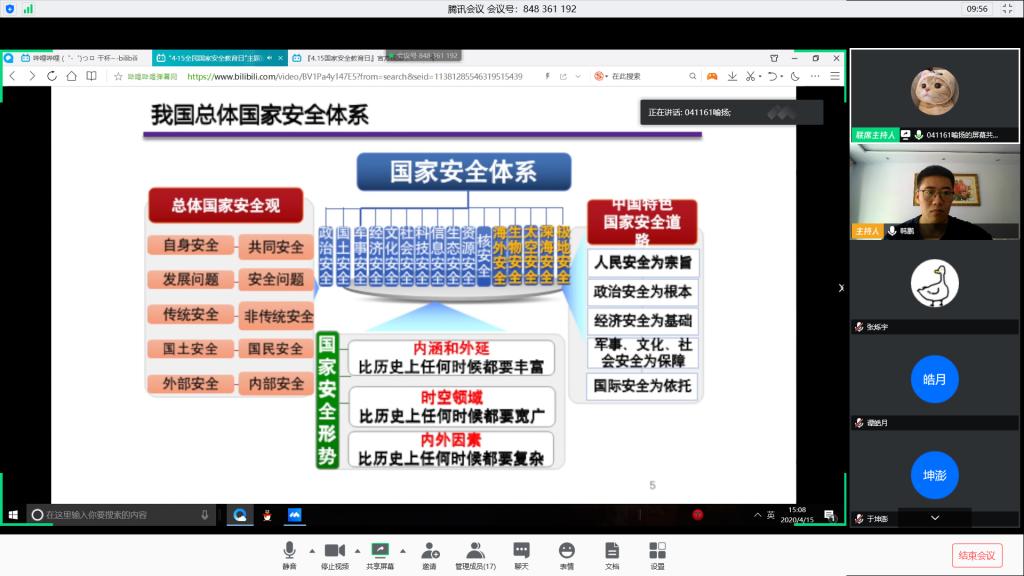(通讯员韩鹏 编辑耿婧)2020年4月15日,是《中华人民共和国国家安全法》颁布实施以来的第五个全民国家安全教育日。为了提高同学们的国家安全法治意识,营造维护国家安全的浓厚法治氛围,增强防范和抵御安全风险能力,beats365官方网站各班以班会形式收看国家安全教育课并依托QQ群、微信群集中开展学习讨论。