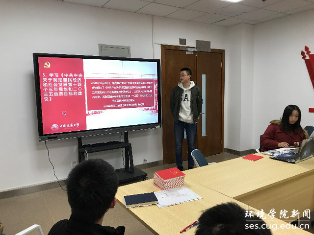 2018级学硕一班硕士研究生党支部晏智伟同志领学《中国共产党第十九届中央委员会第五次全体会议公报》的内容。本次全会,中央委员会总书记习近平作重要讲话,全会听取和讨论了习近平受中央政治局委托作的工作报告,全会审议通过了《中共中央关于制定国民经济和社会发展第十四个五年规划和二〇三五年远景目标的建议》。晏智伟同志介绍到,党的十九届五中全会是在“两个一百年”奋斗目标的历史交汇点,在即将实现第一个百年奋斗目标,开启全面建设社会主义现代化强国新征程的时刻召开的一次十分重要的会议,全党全国各族人民要紧密团结在以习近平同志为核心的党中央周围,同心同德,顽强奋斗,夺取全面建设社会主义现代化国家新胜利。
