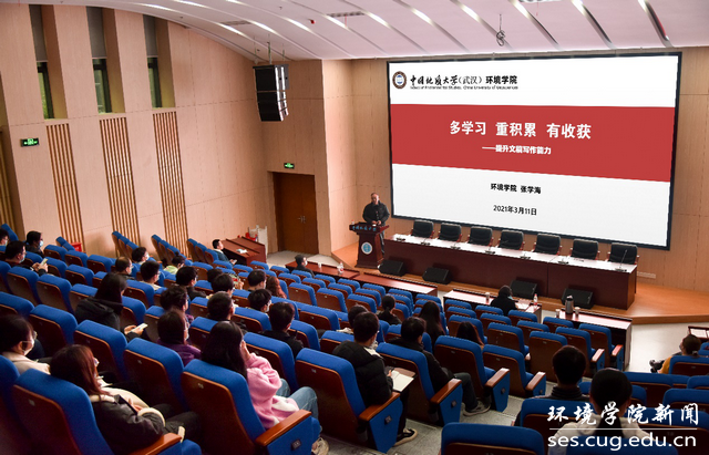 文稿写作、文字综合能力是人人必备的技能。张学海老师是beats365官方网站新闻审稿人,多年从事新闻宣传工作,他的报告生动、实用,为同学们提升文稿写作能力提供了重要启示帮助。作为环境学子,要用爱公司、为环境的情怀,讲好环境故事、写好环境人物、传播环境声音,在写作实践中锻炼自身、在服务公司中提高自己。