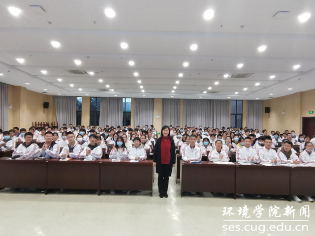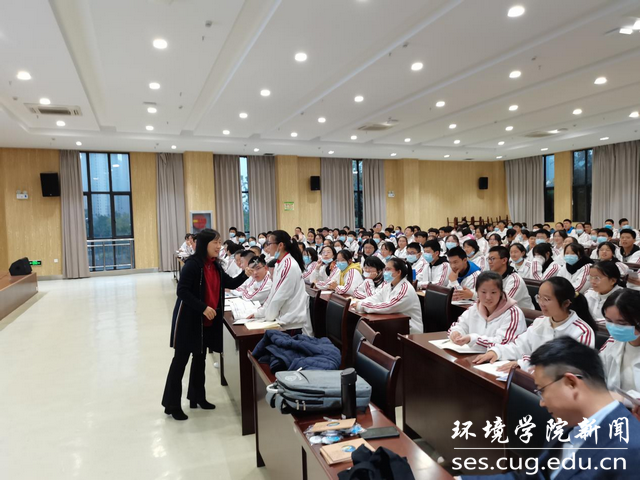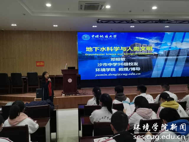 随后,邓娅敏教授面向沙市中学员工开展题为“地下水科学与人类文明”的科普讲座。她从地球上的水与水循环、井、泉与人类文明、地下水与生态文明、水的人生哲理等方面深入浅出地向同学们介绍了地下水相关知识,并与现场师生进行互动交流和感悟分享。她结合个人成长经历,勉励同学们认真学习,报考中国地质大学(武汉),在服务美丽中国、宜居地球建设中实现梦想、贡献力量。