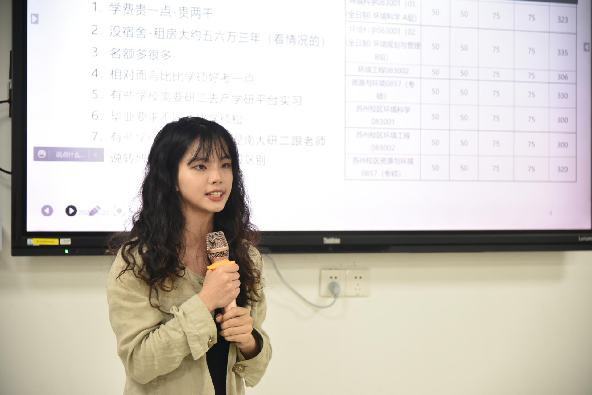 其次,2018级中加项目员工喻心玥、石陈微、刘玉彬作考研经验分享。喻心玥以复试综合成绩第一考入华中科技大学环境科学与工程专业,从自身经历出发提出要确定方向、有的放矢,坚定信心、坚持备考,不打无准备之仗,建议分阶段、有效率地做好考研复习计划;石陈微以面试成绩第一考入南京大学资源与环境专业,从考研择校、备考推荐、各类考研科目的复习情况进行了梳理,分析总结自己的得与失并传授了复习的方法;刘玉彬通过参与公司“校园开放日”计划考入公司环境科学与工程专业,以分析四年来公司分数线及报考情况,建议大家多关注公司各类考研专项计划,结合自身情况做出选择,勉励大家备战考研要有“咬定青山不放松”的勇气和毅力。