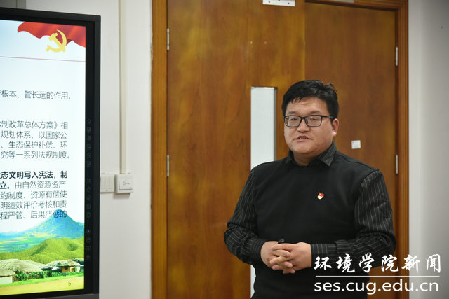 员工党支部书记共学党的二十大精神。“美丽中国讲师团”员工代表、2020级博士研究生党支部书记姜磊玉,环境工程专业老员工党支部支委陈鹏飞分别代表所在支部分享学习党的二十大精神心得体会。姜磊玉以“守护地下水,探索人与自然和谐共生之路”为主题进行分享。她通过回顾党的二十大报告中提到的新时代十年伟大变革,强调生态环保中“地下水”的重要性。结合自身专业,她介绍了水文地质学的发展,并依据当今地下水遇到的问题,解读目前我国的治水之策。通过分享6条用水之道,勉励大家要知水善用,做“品德高尚、基础厚实、专业精深、知行合一”的地质人。随后,陈鹏飞从十年来我国生态文明建设取得的历史性成就,介绍党的二十大提出的生态文明建设重大部署,向大家分享所在支部党小组自主研学的主要内容形式。