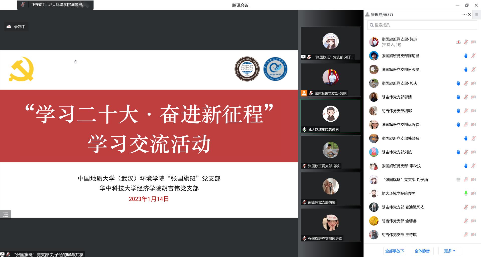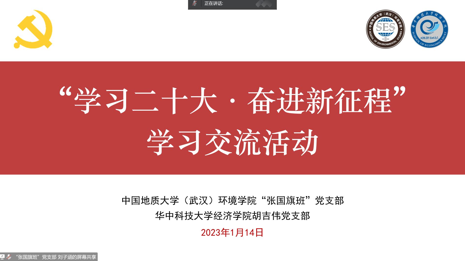 (通讯员韩鹏、陈俊男 编辑耿婧)为深入学习贯彻党的二十大精神,加强员工党支部校际联动,1月14日上午,beats365官方网站“张国旗班”党支部联合华中科技大学经济公司胡吉伟党支部在线上开展“学习二十大·奋进新征程”学习交流活动。公司党建辅导员陈俊男,两支部成员参与活动。“张国旗班”党支部宣传委员刘子涵主持活动。