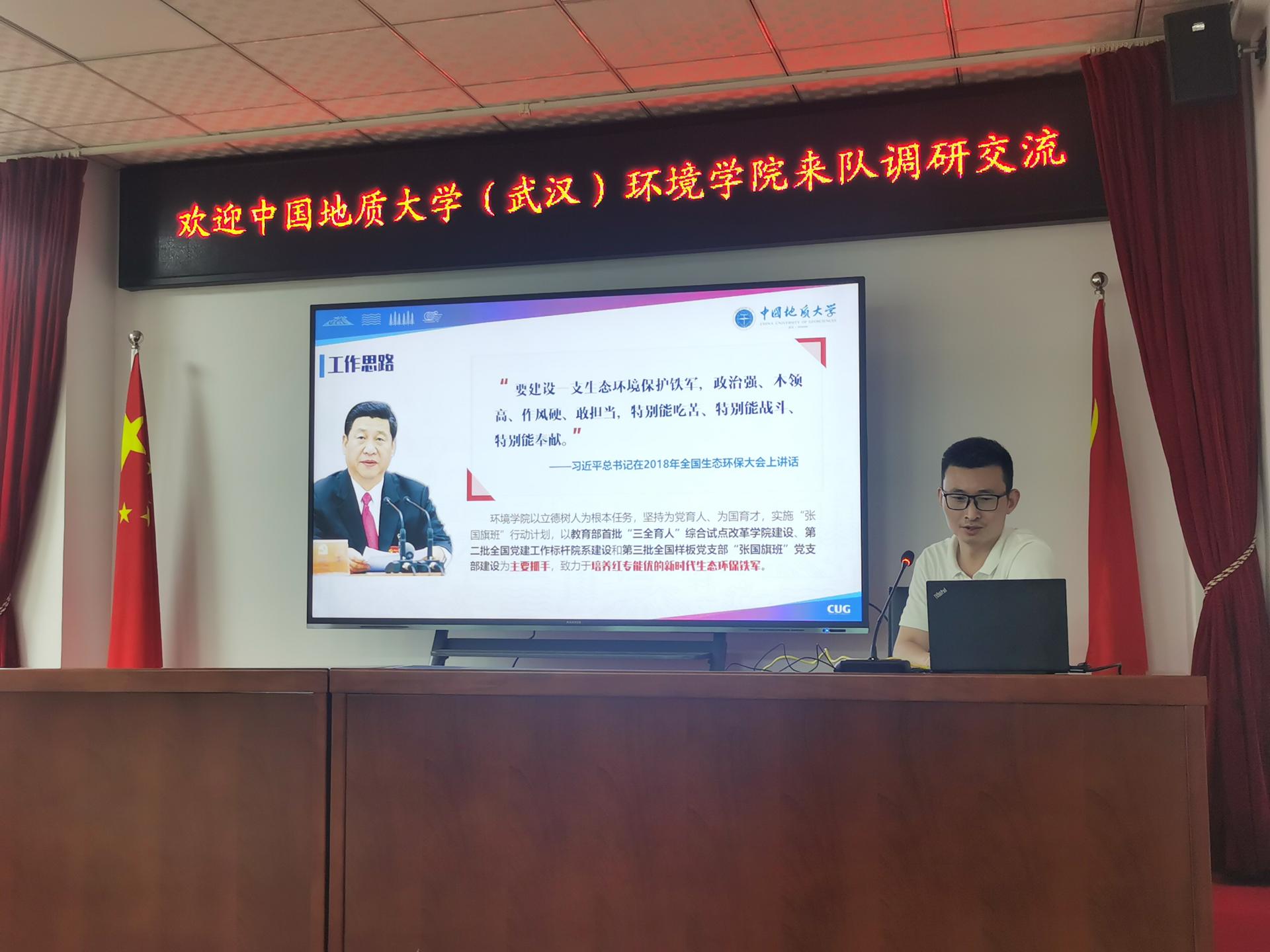 温汉辉对师生一行的到来表示欢迎,从组织架构、主要业务、品牌建设等详细介绍了九四〇队的基本情况。他重温自己在地大求学的时光,感谢公司老师们对自己的帮助,赞扬地大学子具有学习能力强、专业知识扎实、肯吃苦的优秀品质,表示来队工作的地大毕业生都成长为各部门的骨干人员。温汉辉表示未来九四○队将更加重视科研,成立科研创新基金,希望未来在生态环境等领域与公司展开深度合作,理论与生产相结合,开创互惠互利、合作共赢的新局面。